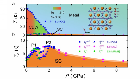 Recently, a novel layered cage structure superconductor CsV3Sb5 has been discovered, which has a CDW transition temperature of 94 K. Combined with a variety of pressure means, the researchers carried out pressure control research on it, and determined the phase diagram of the material under high pressure.